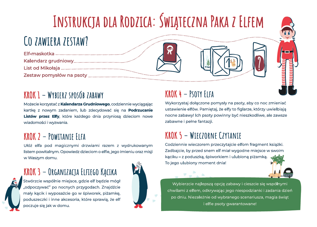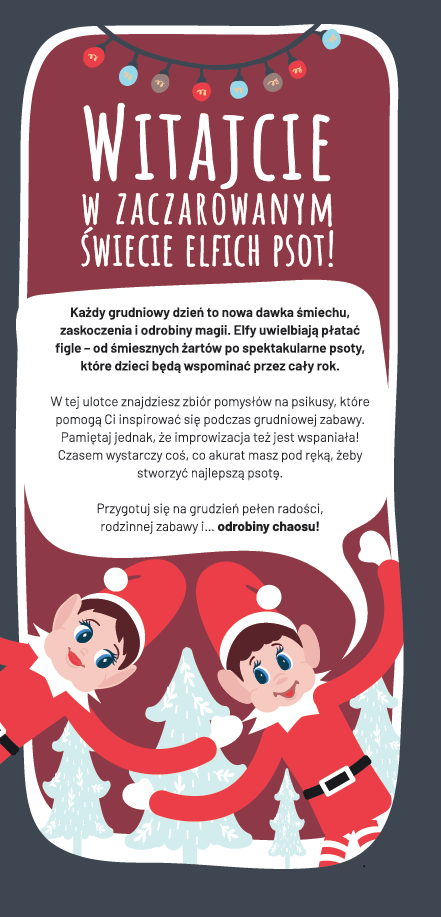 Od maskotki Elfa z drucikami w rękach i nogach, przez list od Mikołaja, aż po zbiór gotowych do realizacji psot. To zestaw, który gwarantuje emocje i magię na każdym kroku świątecznej drogi.